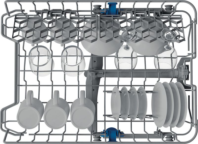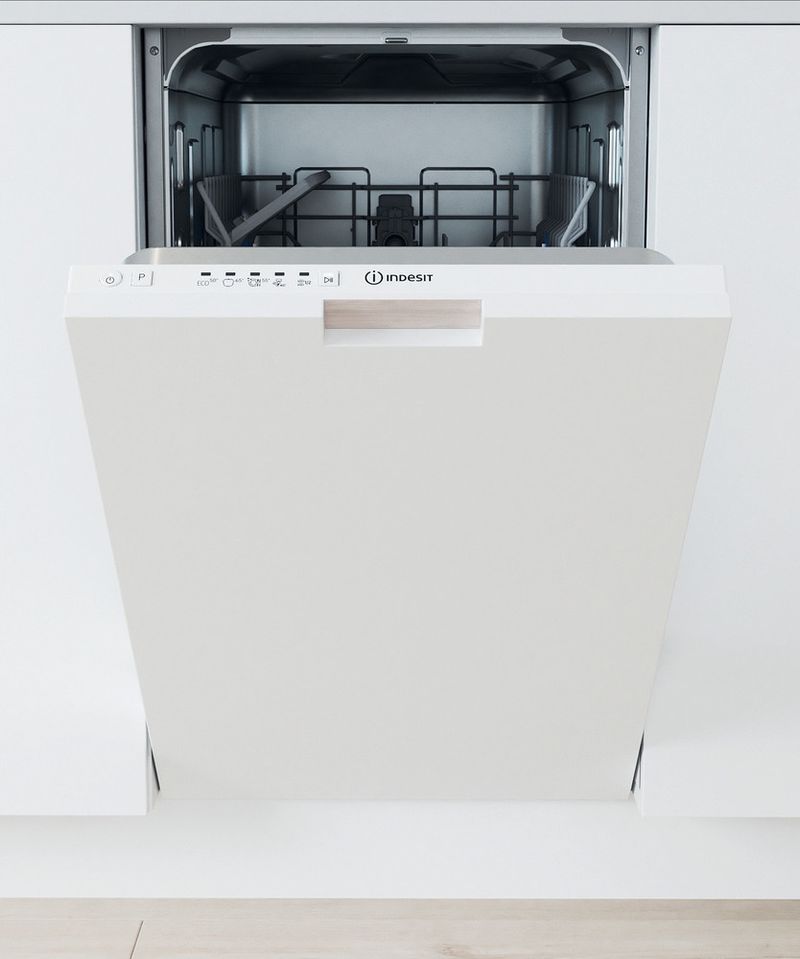 Cechy zmywarki do zabudowy Indesit: niskie zużycie wody w połączeniu z oszczędzającym przestrzeń kompaktowym wzornictwem. Kolor biały. Regulowane stopki zapewniają idealną stabilność, nawet na nierównej powierzchni.